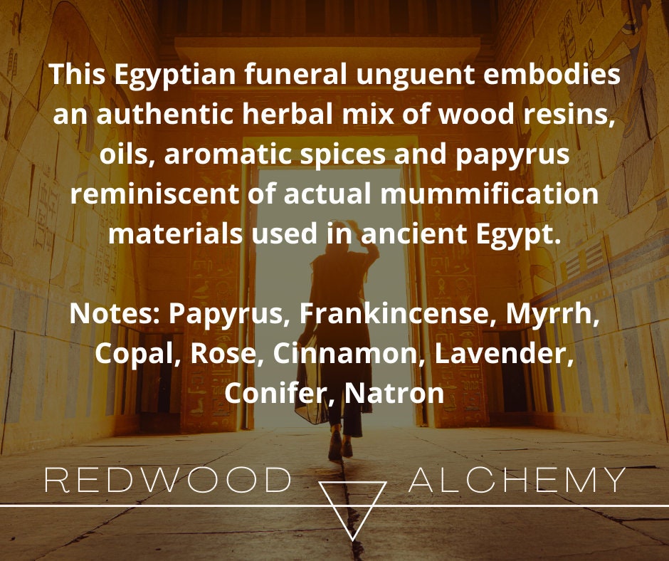 Based upon real-life, historical documents and analysis of Egyptian funerals and mummification rituals, this unguent embodies an authentic herbal mix of wood resins, oils, aromatic spices and papyrus reminiscent of actual mummification materials used in ancient Egypt.