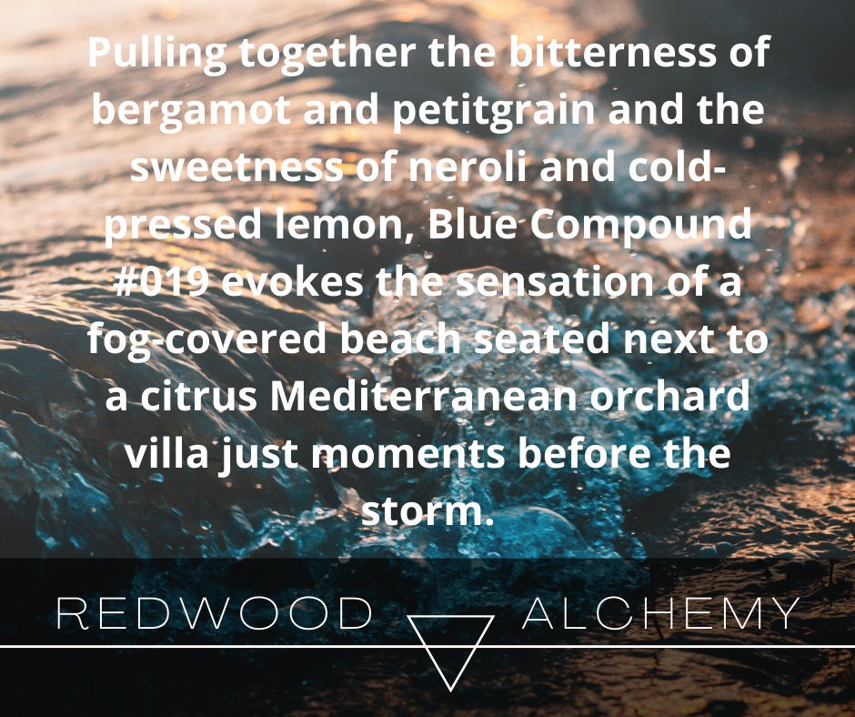 The compounds are divided into sections based on their overall composition and fragrance family, as well as the materials used and feelings the scent is designed to invoke. Pulling together the bitterness of bergamot and petitgrain and the sweetness of neroli and cold-pressed lemon, Blue #019 evokes the sensation of a fog-covered beach seated next to a citrus Mediterranean orchard villa just moments before the storm.