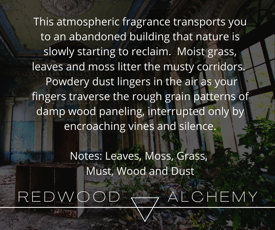 This atmospheric fragrance transports you to an abandoned building that nature is slowly starting to reclaim. Moist grass, leaves and moss litter the musty corridors. Powdery dust lingers in the air as your fingers traverse the rough grain patterns of damp wood paneling, interrupted only by encroaching vines and silence.